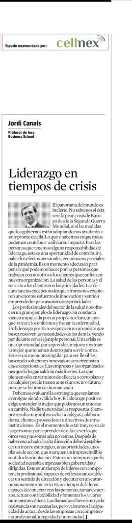 Recomiendo leer a Jordi Canals hoy en el suplemento Dinero de La Vanguardia sobre los “Liderazgo en tiempo de crisis”.